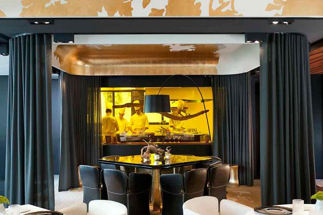Su salón con tonos dorados es increíble y además, la cocina tiene un ventanal por el que se puede ver a los cocineros. Es una experiencia gastronómica completa.